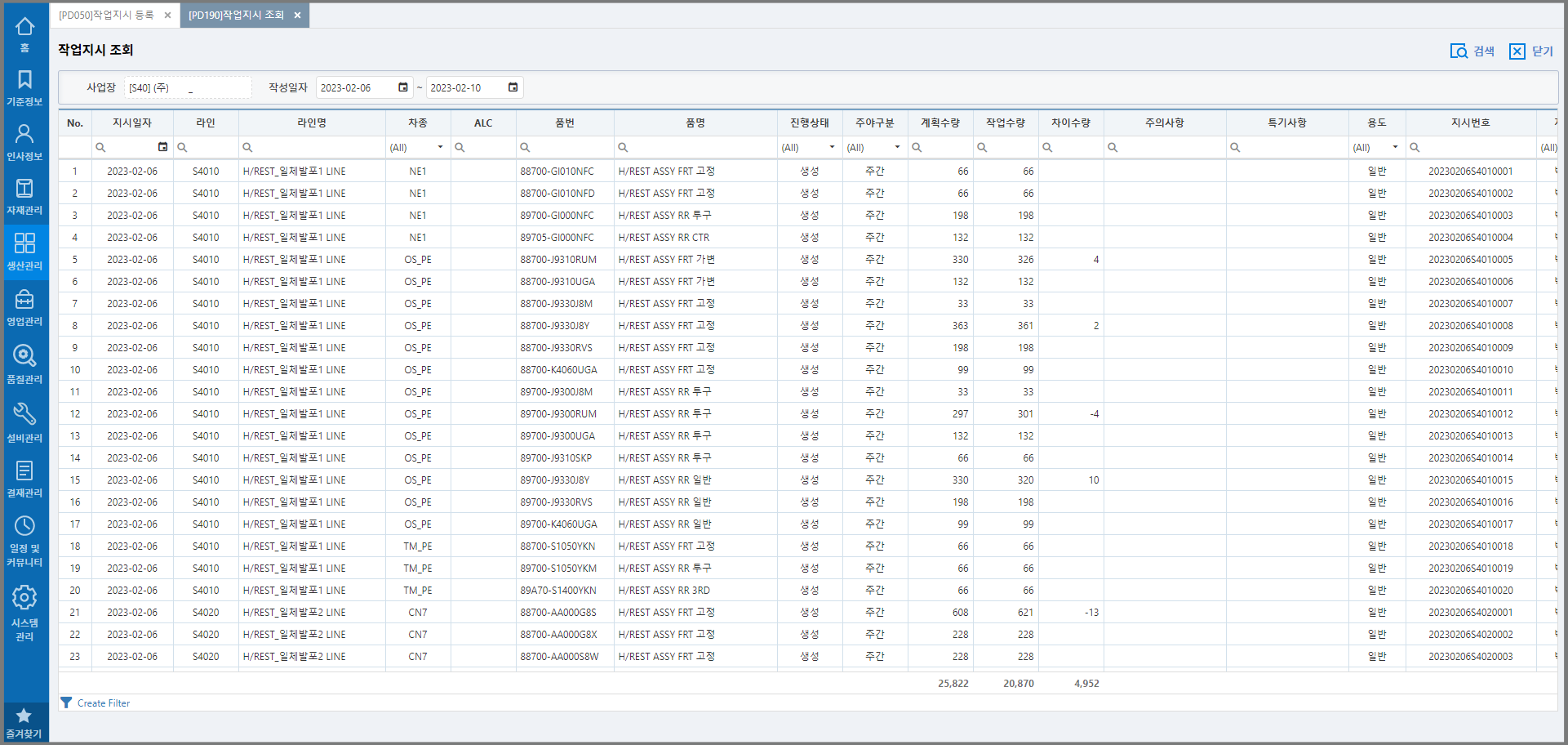 자동화 기술을 접목한 통합생산공정관리시스템(MES)으로 주문 받은 제품과 생산계획을 기반으로 원자재의 라인 투입부터 반제품 및 완제품의 출하단계까지 최적의 생산 활동을 수행할 수 있도록 실행부문에 작업을 지시하고 설비상태, 최적화 수행, 품질정보, 반제품 재공 및 생산 진행 사항을 실시간으로 수집해서 문제 발생 시 조기경보, 조치를 위한 의사결정에 정보를 제공합니다.